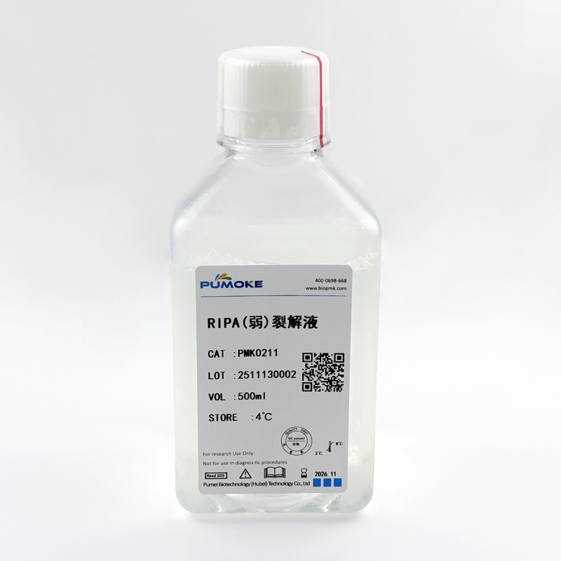 RIPA(弱)裂解液是一种传统的细胞组织快速裂解液。RIPA裂解液裂解得到的蛋白样品可以用于常规的PAGE、Western、免疫沉淀(IP)、免疫共沉淀(co-IP)和ELISA等。